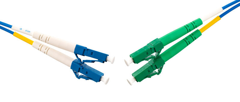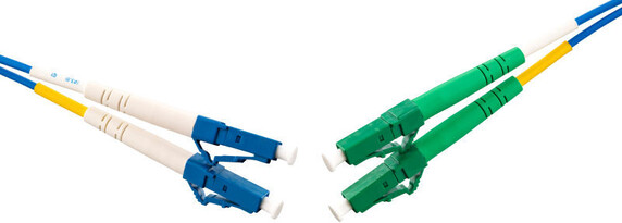 Fiberoptic patch cord singlemode G657A with blue 2mm duplex cable and LC/UPC-LC/APC connectors.