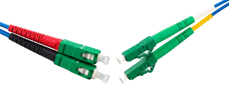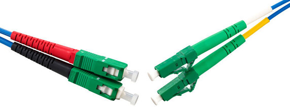 Fiberoptic patch cord singlemode G657A with blue 2mm duplex cable and SC/APC-LC/APC connectors.