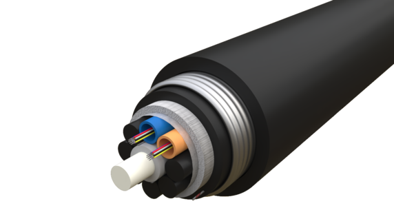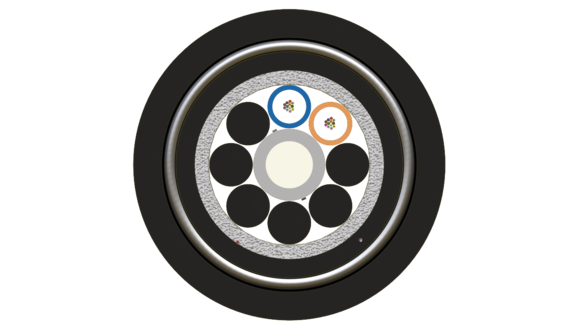 24F G652D armored cables designed for direct burial installation and has full rodent protection. It attains its mechanical robustness and functional performance through its double sheath and corrugated steel tape (CST) reinforcement. Needs no further protection at underground installations. The cable is based on a multi loose tube construction with SZ design around a central strength member of fiberglass-reinforced plastic (FRP) which facilitates mid-span access.