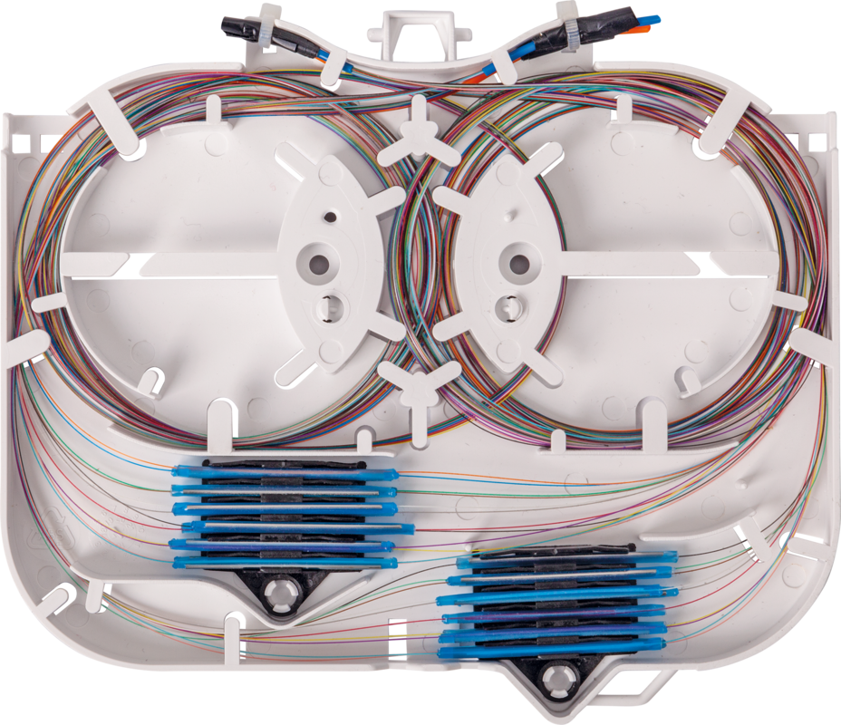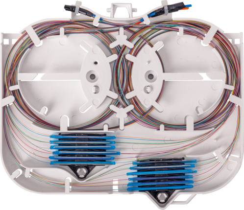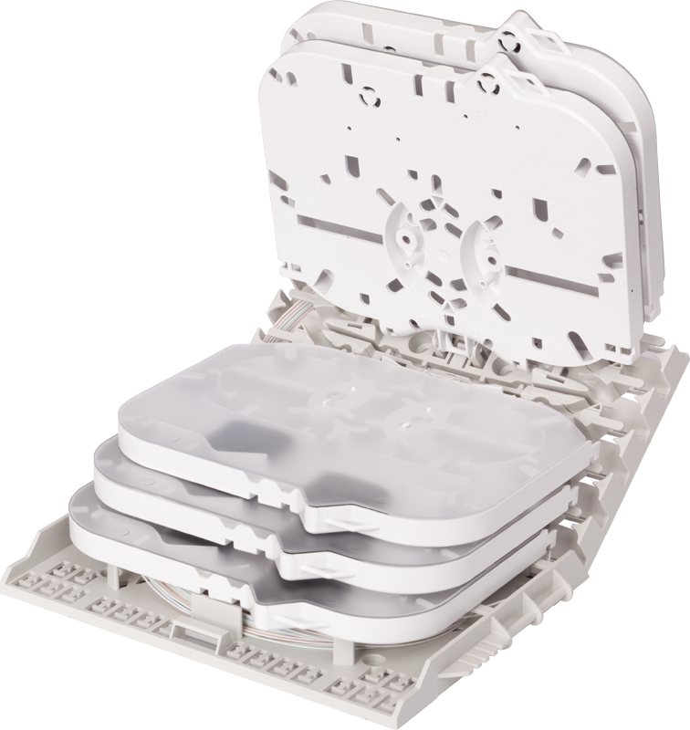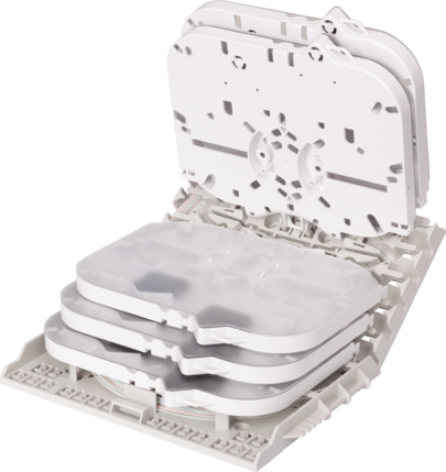 Splice trays are used to loop excess fiber, protect and fix the splice protection sleeves. The trays are available in different designs and sizes to fit different ODFs, termination boxes, closures and cabinets.