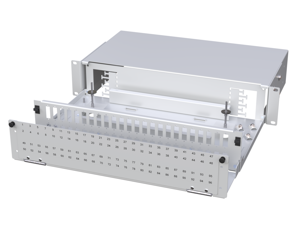 Fiber Optic Patch Panel Ultra High Density (UHD) 1U/2U. The patch panel is made of rugged alu-zinc metal and has a durable powder-coat finish coming in light gray color. The craft-friendly fiber optic trays and an integrated fiber storage allow comfortable assembly.