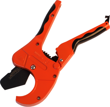 Heavy duty plastic pipe cutter for pipes or microduct bundles up to Ø 64 mm.