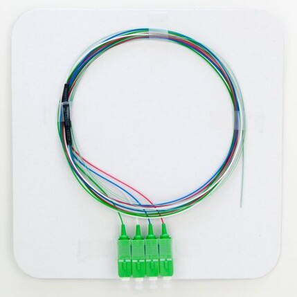 Fibreoptic ribbon fanouts, singlemode G652A1 with pre-terminated connector. To be used for splicing on a fibreoptic ribbon cable. Halogen-free according to EN 60754-1/2 and flame retardant according to IEC 60332-2-2. Meets the requirements of IEC 61300, EN186000-1, EIA/TIA-455 and TELCORDIA GR-326-CORE/GR-63. ID marked with a unique serial number for full traceability to component-level. Each package comes with individual measurement protocols.