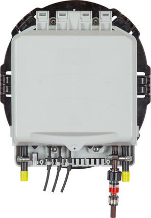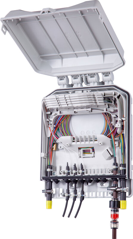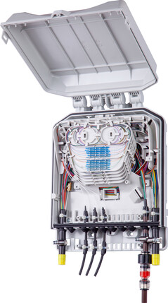 The Fiber Optic Box MAB is used to store up to 60 splices in a flip tray splice system. An integrated pole mount is included, making it suitable as an access point for overhead GPON or 5G networks.