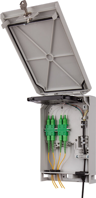 Lockable wall mount optical distribution box is designated for indoor/outdoorwall installation at the customer premises. Box is suitable mainly in FTTH networkto terminate optical fibres on the internal/outdoor walls of the buildings mainly insuburban areas with lower household density (family houses, low household countresidential buildings or offices). Additionally, the box can play the role of the floor distribution box in multidwelling units.