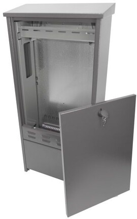 Front doors are removable without additional tools for easy and quick access. Cabinets are equipped with standard cylinder type lock. Supplied with adjustable underground base, metal mounting plate, lock, ventilation flanges, coiling for cable/duct and cable guide cross rail.