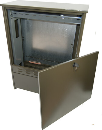 Front doors are removable without additional tools for easy and quick access. Cabinets are equipped with standard cylinder type lock. Supplied with adjustable underground base, metal mounting plate, lock, ventilation flanges, coiling for cable/duct and cable guide cross rail.